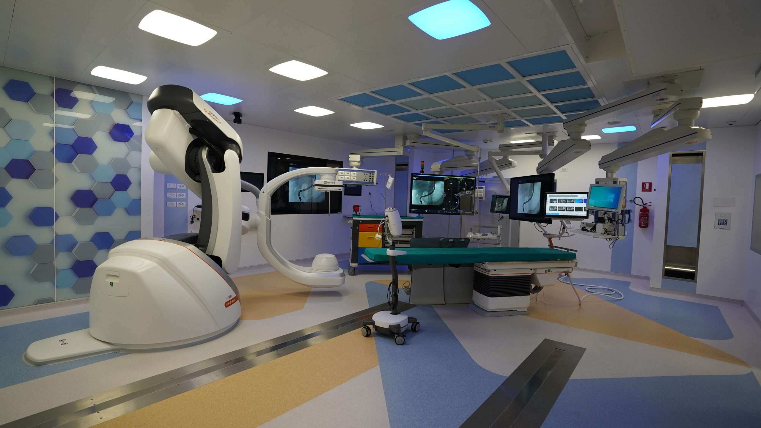 I due ‘gioielli’ di questa sala operatoria futuristica sono una TAC a 128 strati (SOMATOM CT Sliding Gantry) e un angiografo rotazionale a braccio robotizzato ARTIS Pheno (entrambi di Siemens Healthineers) di ultimissima generazione che lavorano in maniera integrata, grazie ad un software dotato di algoritmi molto avanzati di segmentazione che consentono di elaborare in tempo reale una ricostruzione 3D degli organi. La sala ibrida infine è dotata anche di un eco-endoscopio, che consente la visualizzazione diretta della posizione in cui si trova lo strumento ‘dall’interno’, e di aggiungere dunque ulteriori dettagli di imaging.