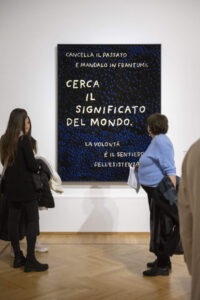 Ma veniamo ai protagonisti della diciassettesima edizione del premio, per la prima volta ospitato alla GNAM di Roma. Il lavoro vincitore, Cerca il significato del mondo del collettivo romano Numero Cromatico, consiste in un arazzo in lana sul quale si legge un testo poetico realizzato con l’ausilio di un’intelligenza artificiale istruita dal collettivo. Su quest’opera si chiude la mostra.