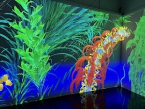 Altra opera di grande suggestività è “Forest Flux” di Tamiko Thiel, creata da un algoritmo collegato all’intelligenza artificiale, che in un video mostra il succedersi delle stagioni, caratterizzate dai diversi mutamenti atmosferici, pioggia, sole, fioritura di alberi e cespugli, con connessi elementi, tra volatili e animali, che insieme formano il complesso quadro di un ecosistema, lo stesso in cui