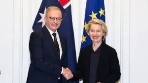 L’Unione Europea e l’Australia hanno raggiunto un nuovo accordo commerciale in occasione della visita istituzionale della presidente della Commissione europea Ursula von der Leyen. L’intesa mira a rafforzare gli scambi bilaterali attraverso una significativa riduzione dei dazi e una maggiore apertura dei mercati, in particolare nel settore agricolo e delle materie prime.